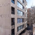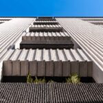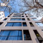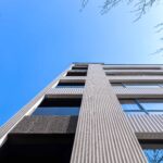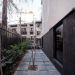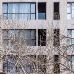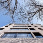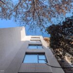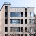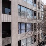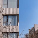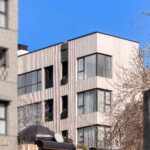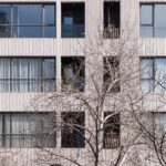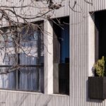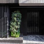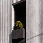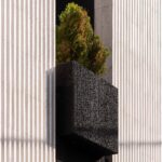 The facade reflects a modern aesthetic, featuring a dynamic interplay of vertical elements and sleek black frames for openings and windows. The strategic incorporation of vegetation and flower boxes enhances the visual appeal, creating a connection between nature and contemporary architectural design.