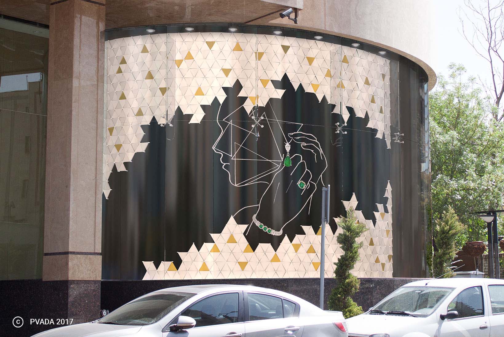an image that has remained constant over time. so, we decided to design a showcase that did not display jewelry but was an image of a woman with a triangular face and post-digital alterations of classic jewelry works. Time remains constant.
